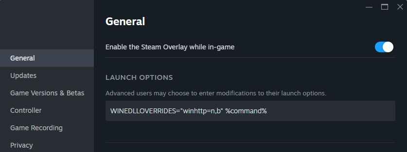 WINEDLLOVERRIDES="winhttp=n,b" %command%