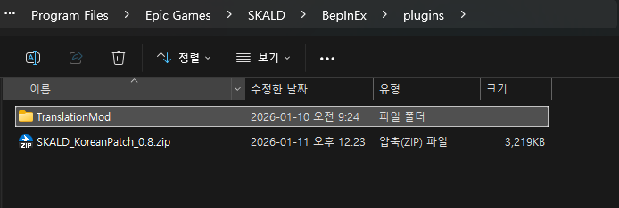 3. ...\ SKALD\BepInEx\plugins 경로 아래에 한글패치의 압축을 풉니다.