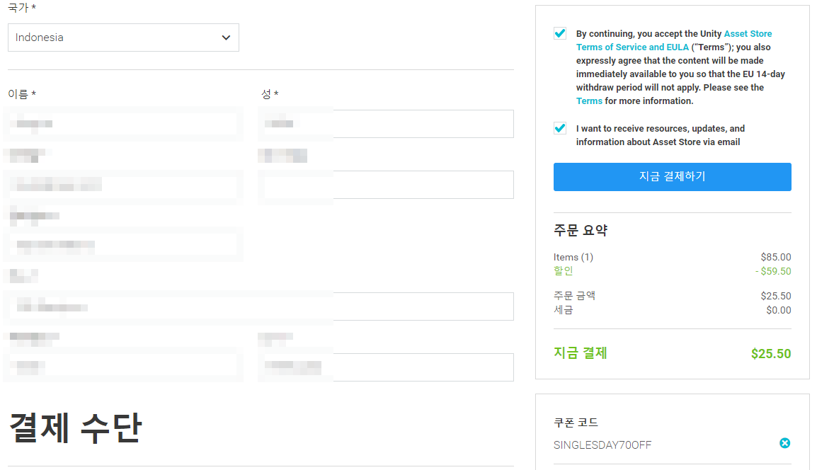 결제할때 국가를 변경하는 것으로 쿠폰을 적용할 수 있습니다.
